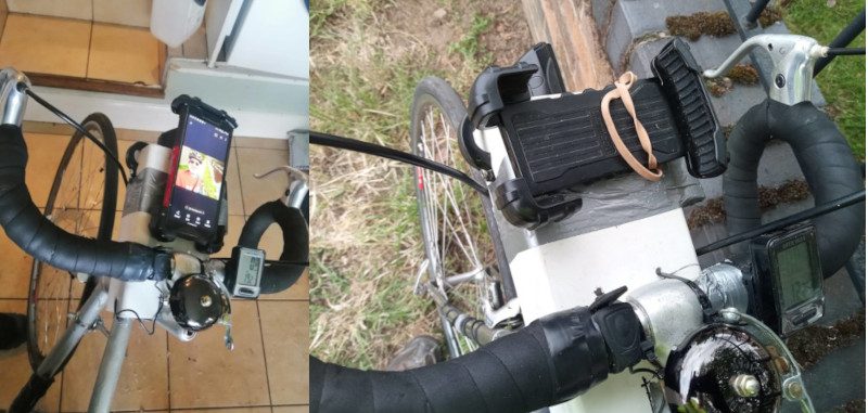 After riding for about 50km I was worried that the USB lead from the battery charger pack to the phone was fouling the handlebars, leading to possible damage. Left hand picture shows original setup, right hand one shows result after I turned the holder by 90°, which involved a certain amount of cutting new holes in the white plastic box! Very happy that USB now stayed in place (especially with a cunningly placed rubber band!), so I could rely on having navigation app on phone.