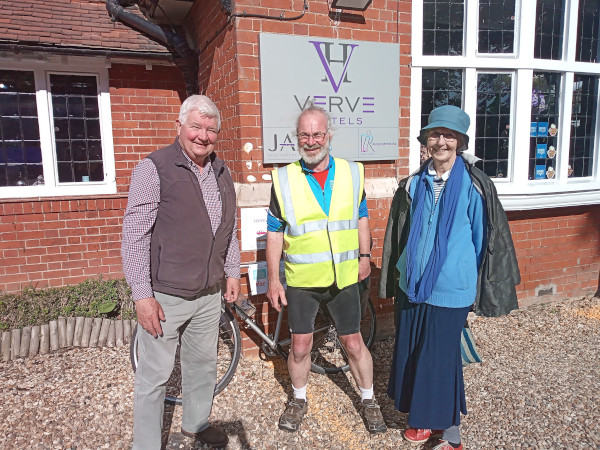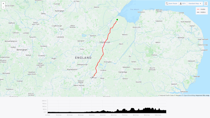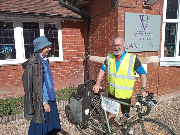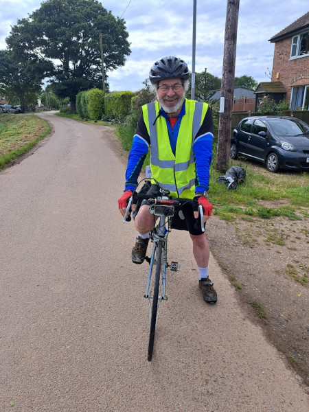 It's day three of my pedalling for Palestine, riding from Leeds to Brighton over five days. So today it was Holbeach to Bedford, and you can see that I'm in a rather nice hotel room here in Bedford. The weather was a bit grey at first, windy, I don't like headwinds, and it was a headwind for at least the first couple of hours, maybe more, but I stopped at a lovely pub just outside Peterborough, at the Marigold arms, I think it's called. Certainly Marigold is in there and [it] had the best fish and ships I've had for ages, and that was most welcome. That bucked me up considerably. I also managed to solve when I arrived there, the problem that I turned my phone somehow so that the brightness was about zero and I couldn't see anything on the screen! And you just get the feeling that sometimes there might be something on a navigation map that you might want to see and not just listen to the nice lady talking. But I was able to sort that, no problem. So then, I noticed I bucked up a bit after lunch, pedaling a bit faster, had a couple of stops for gels. And at the top of one hill, about 20 miles from Bedford, another cyclist stopped and we had a chat and he said, yeah, Palestine terrible, and he gave me a donation, so I must put that on. And led me down the best hill. I got, I think 58 kilometers an hour down that hill! And then he went off to his home and I pedalled on to here. What was especially nice was being met by Linda and Peter Mesney. We'd texted so that we arrived here [at the same time]. More or less, I think they'd been waiting a little while, but not too long. So that was really great to be welcomed in. So now my bike's, not exactly tucked up in bed, but it's put, somewhere out of the way, nice and safe. And I'm here. There's a restaurant downstairs, there's a shower awaiting me there, and so I shall be relaxing, getting ready for tomorrow. Aches and pains, I've had a bit of tingling in my hand from time to time, pins and needles, my bottom is complaining, it doesn't like having a saddle, it much prefers a recumbent seat. But a road bike is quicker than a tricycle recumbent and much more nimble shall we say. So my bottom will just have to put up with it. Other than that all good. Slight twinge from my left Achilles tendon but you know I'm very old so you expect these things. Right take care! Bye for now.