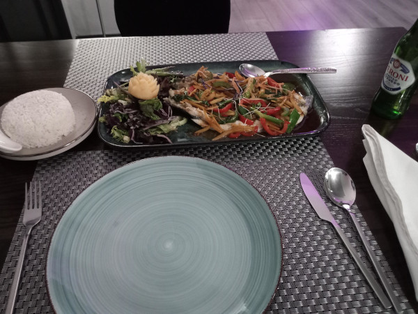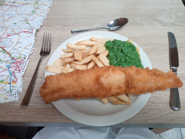 Early lunch stop; I was feeling a bit miserable - weather a bit windy & chilly. Stopped at a pub with fish & chip caravan at the back. This was a real boost!