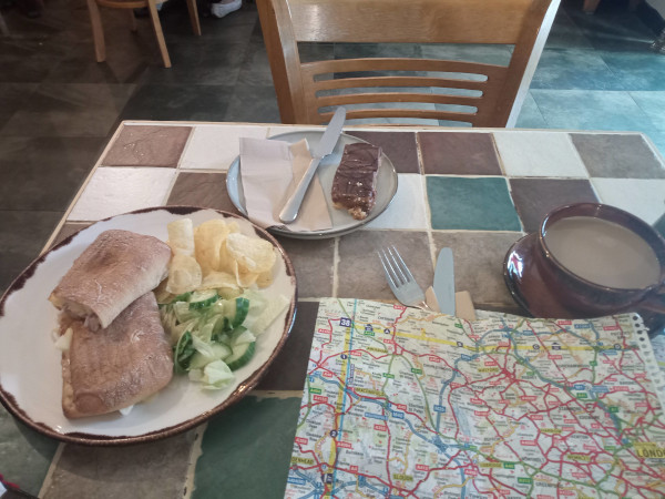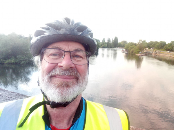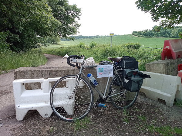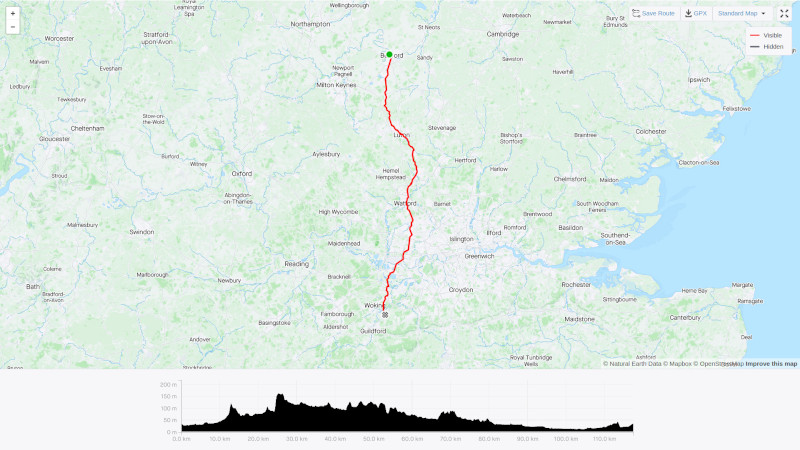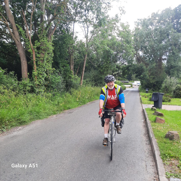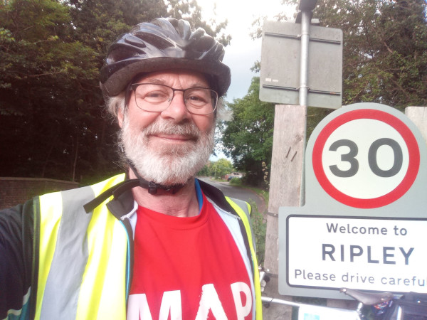 Here again, day four of my pedalling for Palestine ride Bedford to Ripley, which turned out to be 73 miles, not too bad, long, taken me from ten o'clock till quarter past seven, with stops of course. The worst bit was definitely Luton, which had far too many cars, most of which were stopped and in my way! I was a bit bad tempered, but it's bad to be bad tempered because I was cross with a car and then I realized that I'd missed my turn and had to go back. So, you know, karma and so on. Good weather, not too much wind, plenty of coffee, probably far too many gels, but they definitely keep me going. And I can recommend the, er, is it caramel latte a lovely lovely coffee gel. Just pure energy and you glug it down and away you pedal! Bike's going well, I'm going reasonably well, pedalling at least as fast at the end as at the beginning. It's always nice. So tomorrow last day! I should be getting to Brighton about five o'clock. Bye for now.