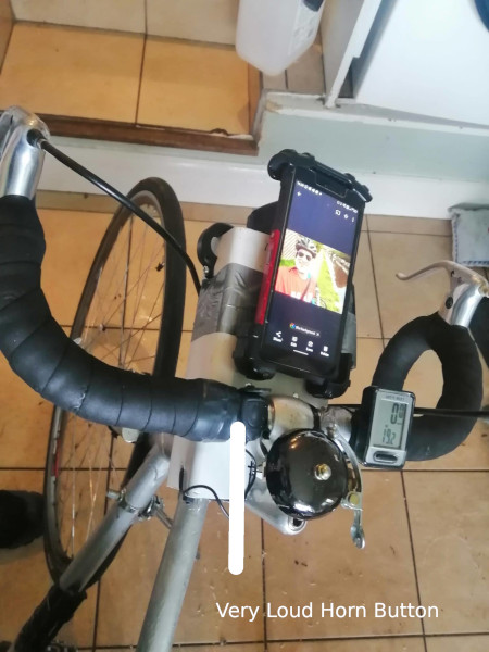 I wanted to have quite a lot of things on the handlebars - bell, cycle speedometer, front light, phone holder - essential for navigation! - and finally, the Very Loud Horn for Bad Drivers. I also wanted to be able to hold the top of the bars! So I repurposed some of extractor fan box section rectangular plastic tubing - the horn is inside, phone on top, light on the side, with the bike computer on the bars and the bell on the stem. I now have plenty of room on the top of the bars ;-).
