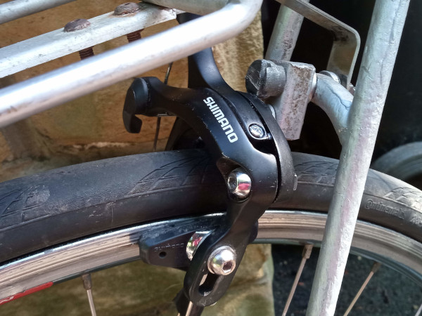 It's two days before I set off, so I have given the bike a clean and lubed the chain. The pics show the miniscule clearance at the front - the shiny stainless steel forks are not the originals. (These were fatally damaged when I was on a bike tour of Ireland in 1965 - I was taking off a jumper while riding along, and a sleeve caught in the front wheel. I found myself balancing briefly on the front wheel, and the forks bent dramatically. We turned them 180 degrees so the front wheel cleared the frame. Ultra short wheelbase - very twitchy geometry!). So I have extended the slots on the brake arms so that the brake blocks sit hgher. At the rear, the opposite problem applies - I could do with extra long arm brakes, but as only short arm ones were available, I made an extension from an old crank. This arrangement works fine!