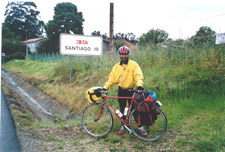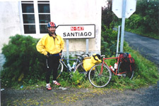Further on, we came to a big roundabout, and took the road to Santiago. It was a very wide dual carriageway… and then it dawned on us that we were on a motorway! We gingerly crossed it, climbing the barriers, and got over a fence. This brought us to a small road encircling the airport, which led in the right direction. It was a strange day, because previously, we’d pressed on to our overnight stop, but on this day, we didn’t want to arrive in Santiago until Jane had flown in from London. Hannah was coordinating operations, so we sent and received texts. It was time for lunch. We stopped at a bar about 10 km outside the city, enjoyed a beer, and a game of snooker. Then the call came from Hannah – Jane had arrived, time to get to Obradoiro Square, and the cathedral. We sped off, then I noticed something odd about Chris, and I realised he wasn’t wearing his helmet! I went back to get it; I wasn’t prepared to let him go for it, unprotected! As we rode down to the city, I took extra special care to ride safely, keeping further behind Chris than usual. It turned out we were both worried about having a last minute crash after all the miles we’d covered. It was odd cycling in city traffic, after all the rural roads, and then suddenly, we were in Obradoiro Square, and there were Jane, Hannah and Paul, her boyfriend.