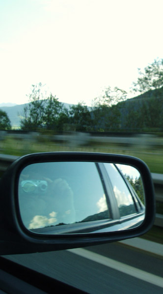 On the way to Croatia in the summer, it was so distracting when Teresa leaned over to take a pic of her camera in my mirror; what was wrong with her one??