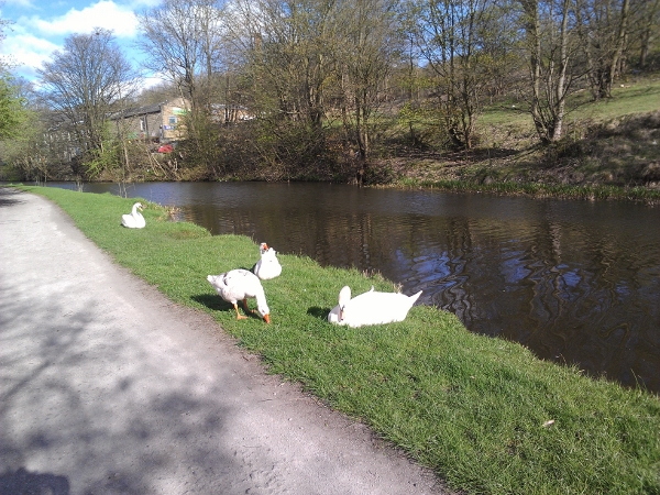 4/06/15 Afternoon ride, lovely & sunny, testing a bike I'll soon be passing on. Went down Stanningley Road, then Canal Road, & then on to the canal towpath. Lots of people walking or cycling by the canal. Passed workmen sweeping uo gravel - hooray! Helpful cyclist stopped to check I was OK when I was investigating a slight, regular wheel-speed 'click, click..' - couldn't find cause!! Pics show ducks (well, actually, drakes...) & bike. I did cross-country MTB races on this machine- in the last millenium - removed mudguards for that ;-)