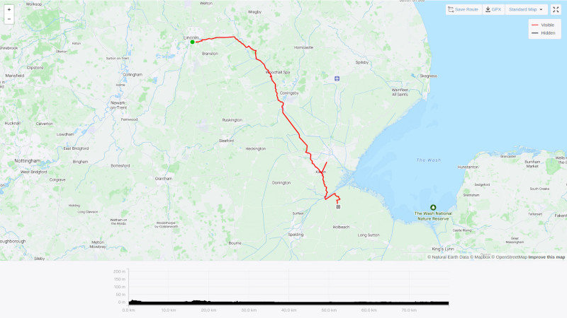 Tim here again, end of day two, my pedaling for Palestine from Lincoln to Holbeach today. It's about 50 miles. I thought it was going to be quite easy because, you know, Lincolnshire flat, but no, it was quite hard because it was raining a bit, always a bit yucky. And also it was windy, but unlike yesterday, windy in the wrong direction. Now, unfortunately, I don't know how to go from selfie view to the other view, so let's just hope this works. I want to show you how I power the phone. My phone won't last a whole day, giving me navigation and whatnot, so it has to have a data bank, not a data bank - it has to have a backup battery and a very long wire. And then, here, the USB cable has a nasty habit of falling out. (You can tell we're in Lincolnshire because of the plane, and I'd show you a picture but the cloud cover is too low.) So, to make sure the USB cable stays in, I have a little rubber band. That usually works. While I'm here, I might as well show you the extra loud horn, which I haven't had to use at all in Lincolnshire. There were three close passes yesterday when I was in Yorkshire. But in Lincolnshire, they seem, the drivers, to know that you just need them to be there, to be a long way away from you, five feet, and I don't have a problem with it here, which is great. Thank you, Lincolnshire. Okay, tomorrow I head to Bedford, 60 miles, so not too bad, 50 today, all right, see you tomorrow. Bye for now.