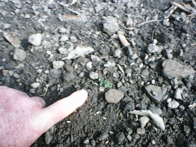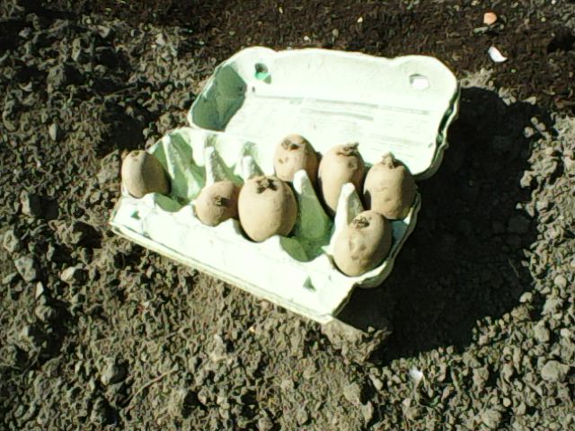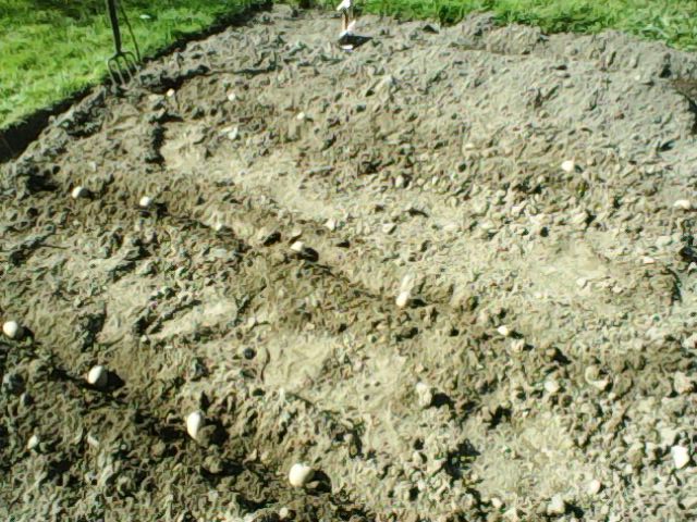 The sprouters and the first earlies went in a few weeks ago, and last week, the very first greenery was showing. Then today, you can see that both rows of spuds are breaking out of the ground. Nothing yet from the main crop, but they went in later.